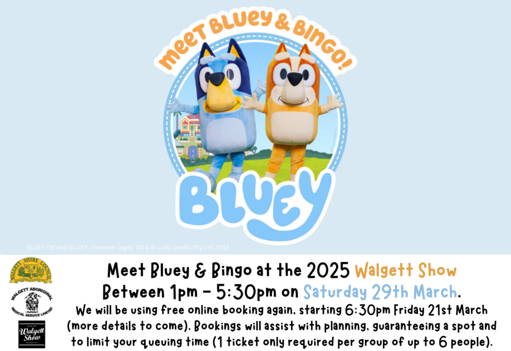 Meet Bluey and Bingo is going ahead on Saturday afternoon, with a change of venue to Walgett RSL Memorial Hall. We apologise to any ticketholders who will be unable to attend due to the wet conditions.