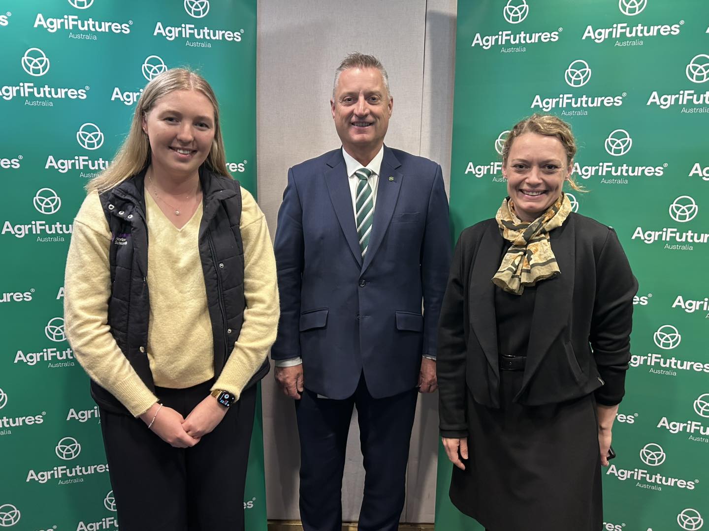 Georgia Ditchfield AgriFutures Horizon Scholar with Jamie Chaffey MP and Carol Mudford NSW winner of the 2025 AgriFutures Rural Women's Award at the AgriFutures Australia morning tea Parliament House recently - Image courtesy Jamie Chaffey MP.