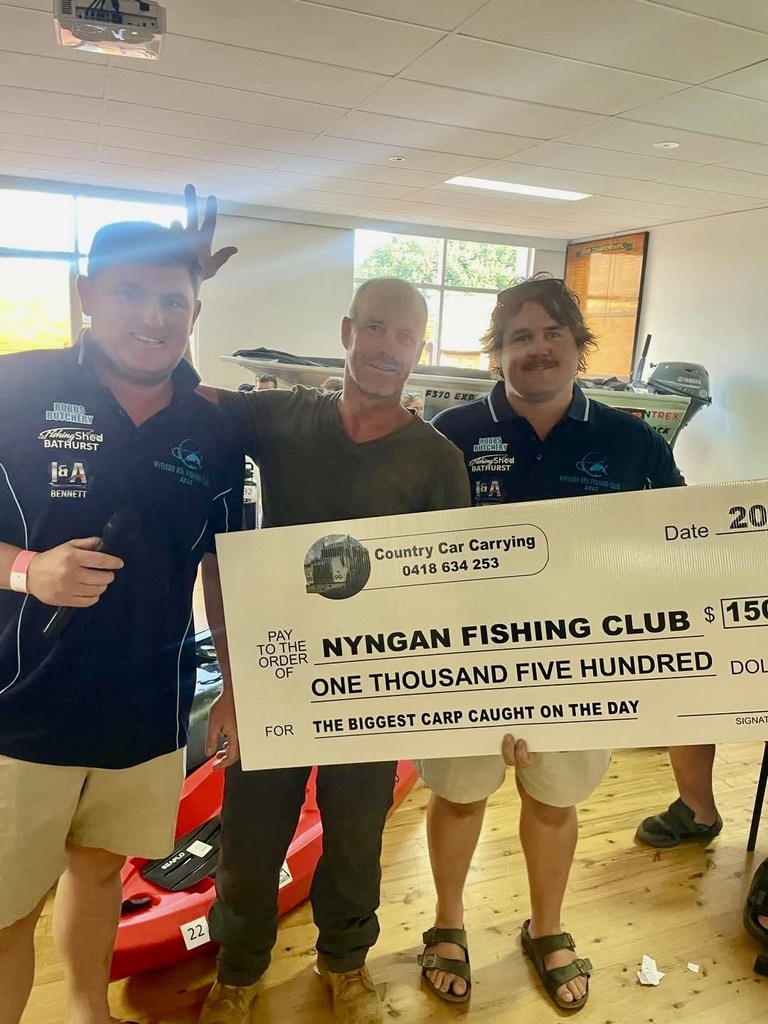 Winner of the biggest carp Brett Grant (middle) with President Jake McClelland and Committee member Colin Piper - Image Nyngan RSL Fishing Club.