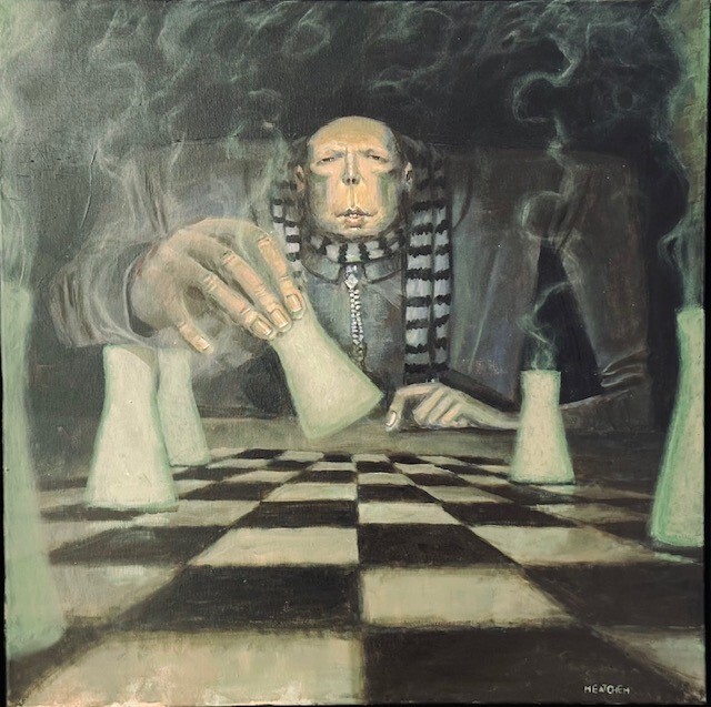 The artworks were judged by Maude, the infamous sulphur-crested cockatoo. She picked Phil Meatchem's Despicable Ploy, which depicts Peter Dutton playing chess with nuclear power plants, as the winner.