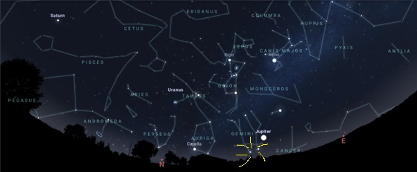 Look for Jupiter, the brightest object above the northern skyline. IMAGE: Stellarium Online