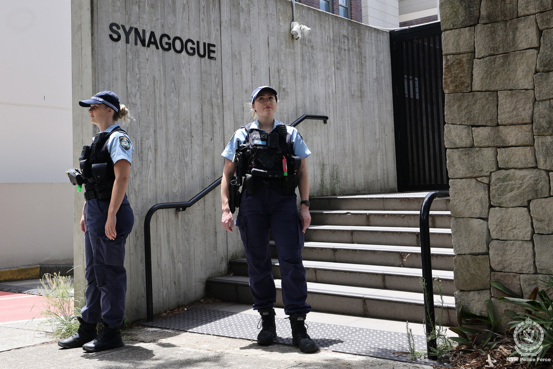 Police stand guard at Bondi Synagogue in the wake of attacks on Bondi Beach. [Image NSW Police Force]
