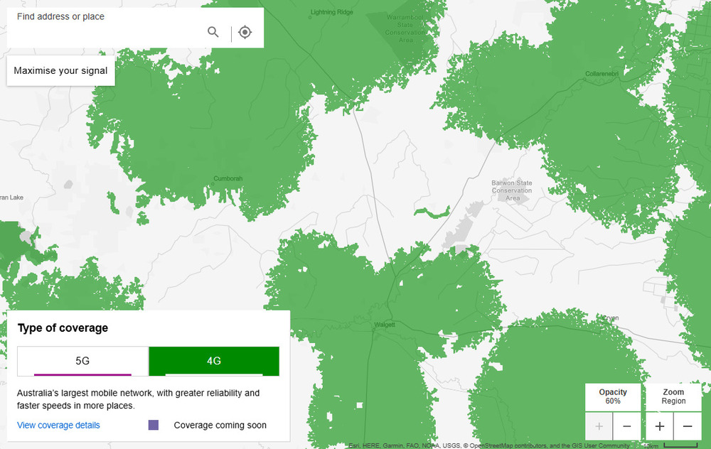 A screenshot of Telstra's 4G coverage map between Walgett and Collarenebri.