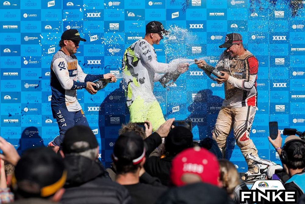 Campbell Hall (right) celebrates with winner Corey Hammond and 3rd place getter Brodie Waters. [IMAGE: Finke Desert Race Photography]