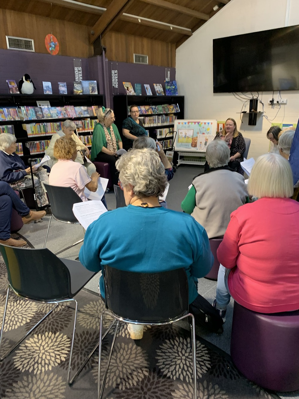 Regional Manager Erica Kearnes sits down with elderly community members for a scam awareness talk at the Warren Library. Photo: supplied