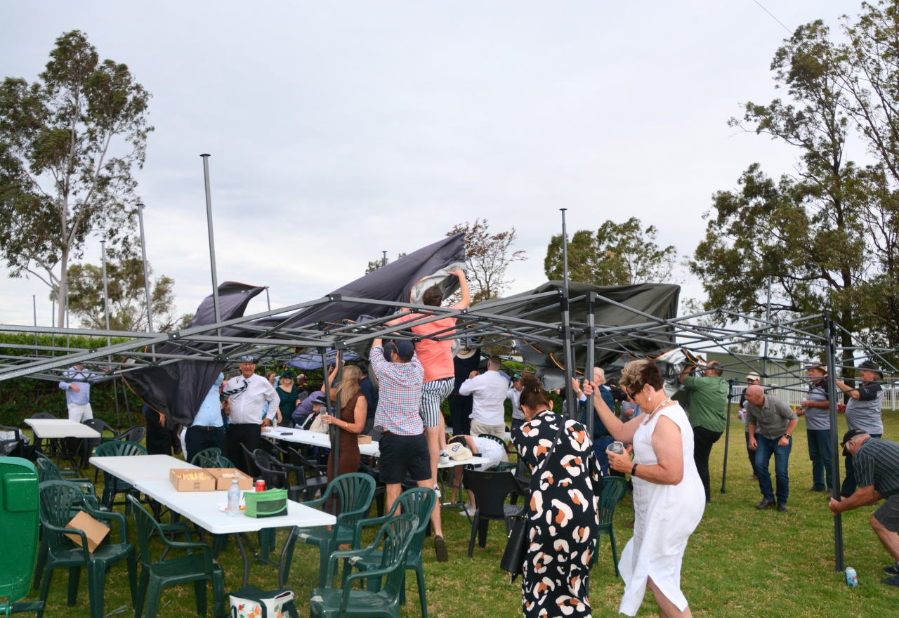Race-goers help remove the tart from marquees after strong winds blew them over. [IMAGE: Kelsi Davis]