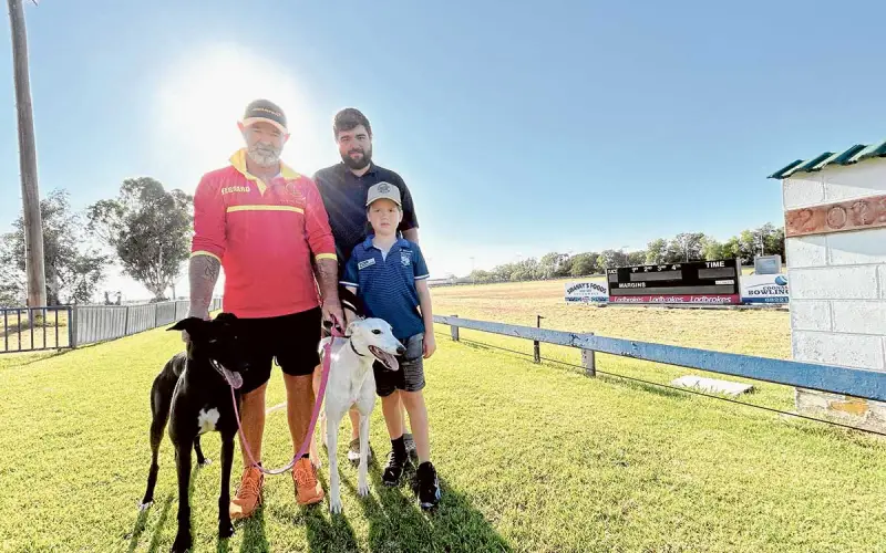 The future is uncertain for Coonamble trainers like Damien and Aiden Lee (pictured with Nate Hodges and greyhounds Rhea and Eva.