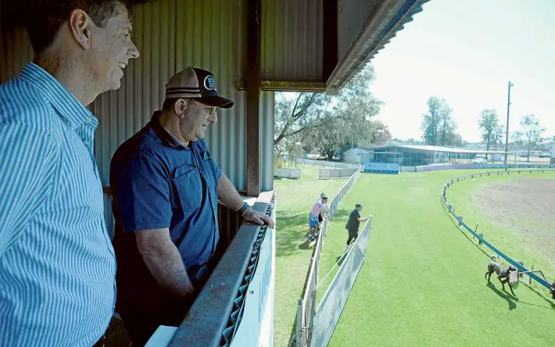 Nationals MP Dave Layzell watches a dog trial with Coonamble Greyhound Racing Club president Graham ‘Boppa’ Pickering. [IMAGE: Coonamble Times]