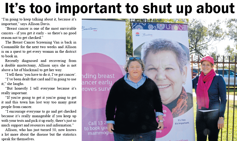 An excerpt from the Coonamble Times article about Allison Davis [left] that saw numbers jump during the visit by the BreastScreen Van.