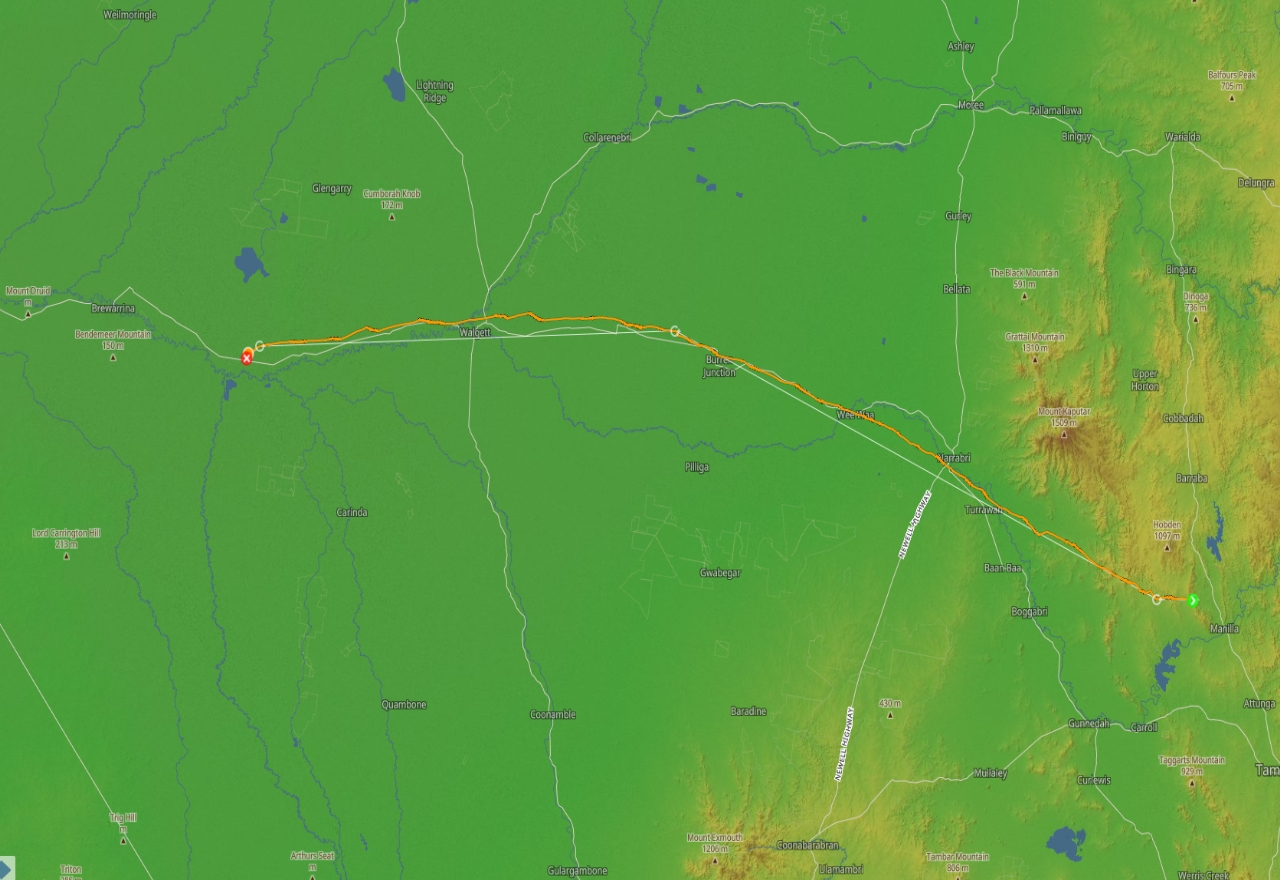 Matthias Kuhn currently holds the claim to the longest paraglider distance travelled in the 2026 Australian XContest. The image above tracks his over-eight-hour flight ending in Brewarrina. SOURCE: XContest