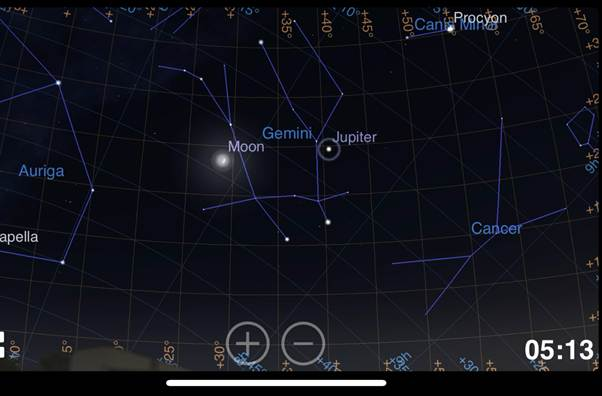 Jupiter appears brilliantly in the constellation Gemini during the morning sky.
