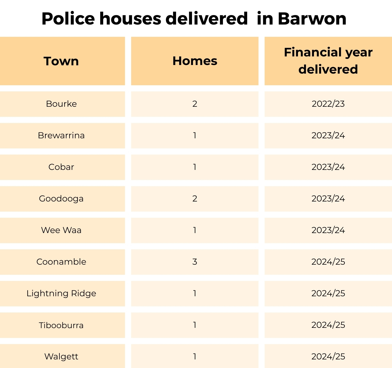 Police housing delivered in the Barwon electorate during the three years to 30 June 2025. SOURCE: NSW Government