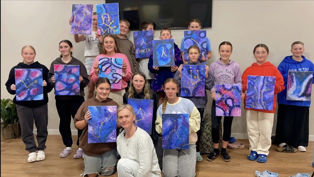 Deanna Banford pictured with junior artists in Nyngan - Image supplied