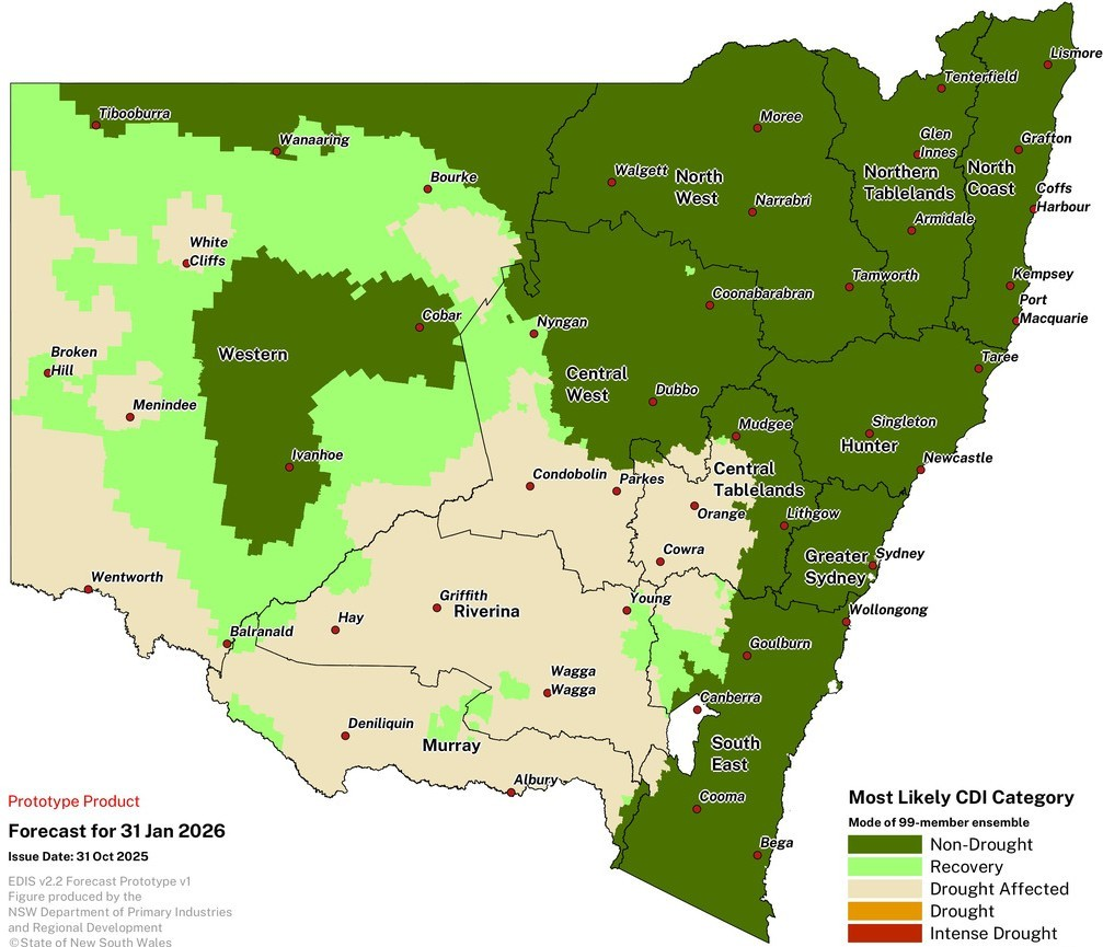 The current drought map forecast until January next year [Sourced NSW Department of Primary Industries and Regional Development drought forecast].