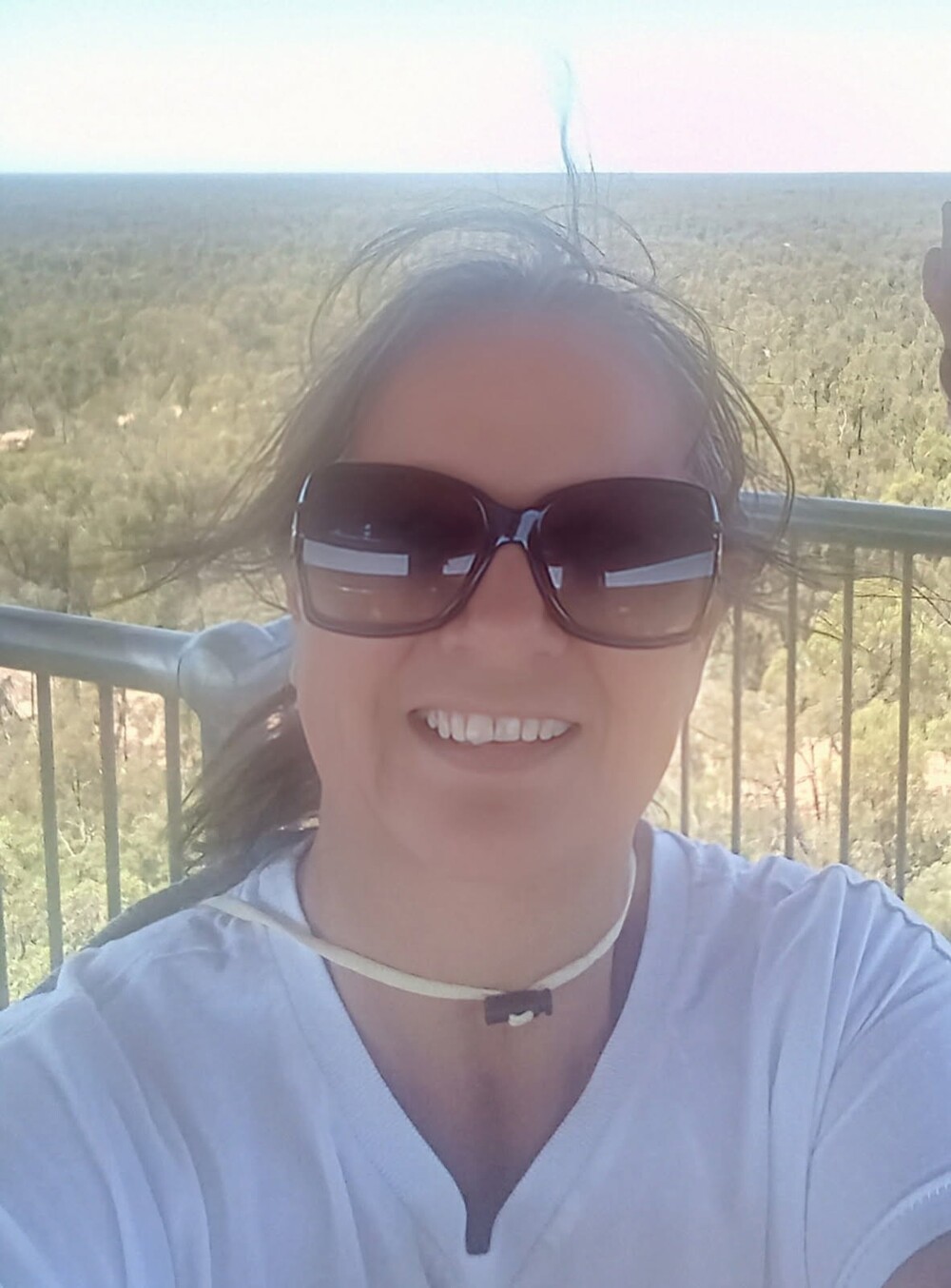 Suellyn Tighe at the fire tower in the Pilliga Scrub. (IMAGE: supplied)