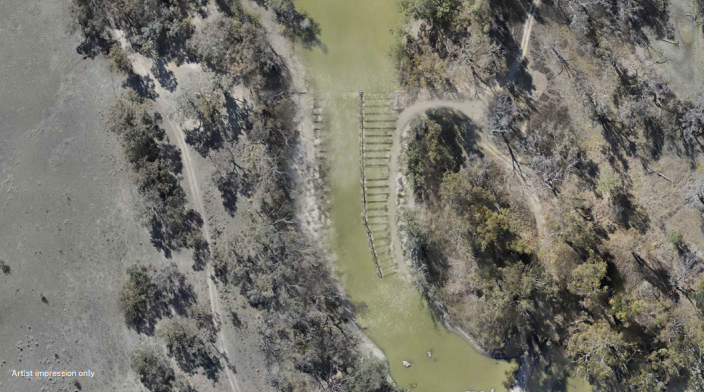 Aerial view of a concept design for Calmundi Weir fishway as at March 2024. [IMAGE: DCEEW]