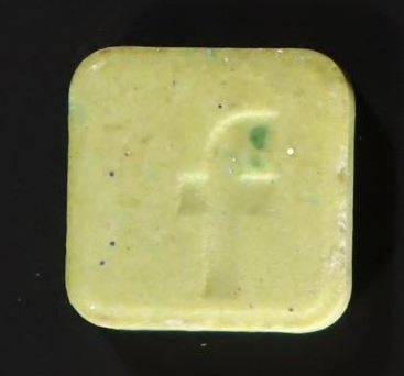 Square yellow tablet with the facebook logo found to contain 256mg of methamphetamine.