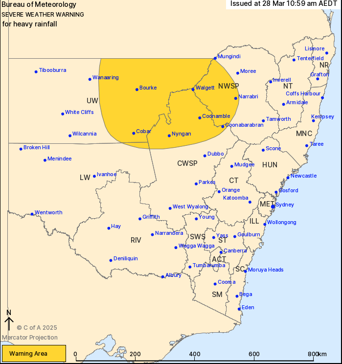 The Bureau of Meteorology announced a severe weather warning for heavy rainfall for parts of the Western Plains in the morning of Friday 28 March.Â