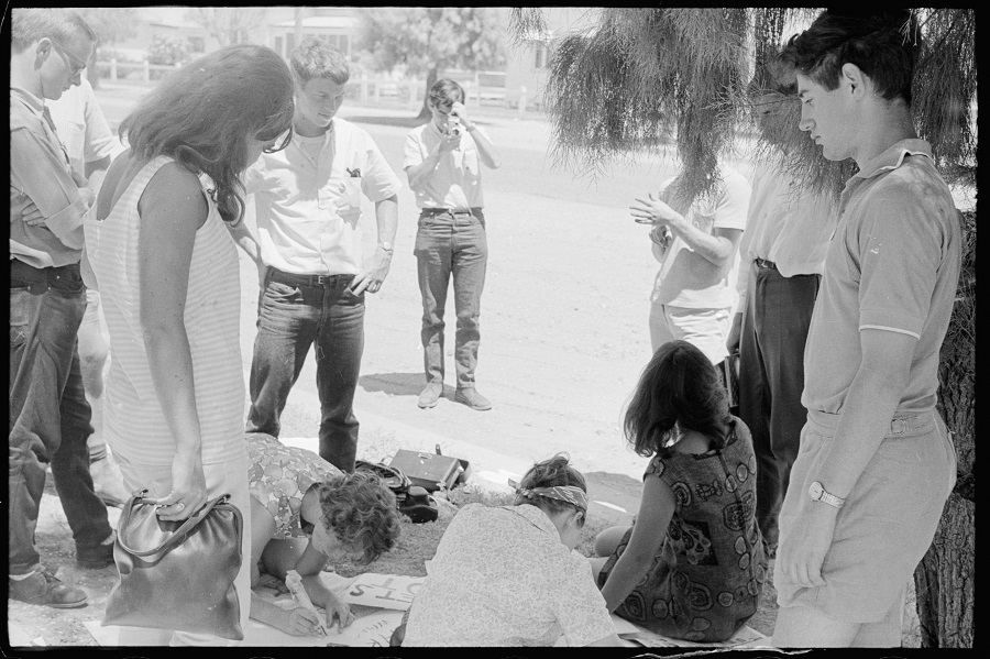 Students from the Freedom Ride prepare protest signs at Walgett in February 1965. IMAGE: Mitchell Library, State Library of New South Wales and SEARCH Foundation.
