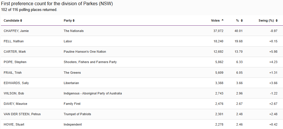 In the latest tally, the majority of first preference votes counted in Parkes have gone to the Nationals as predicted.