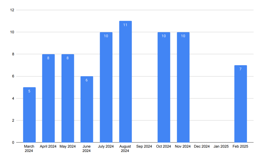 The number of applications recorded on the social housing waitlist for Lake Cargelligo at the end of the month. Figures were not provided in September and December 2024, and January 2025. SOURCE: Department of Communities and Justice