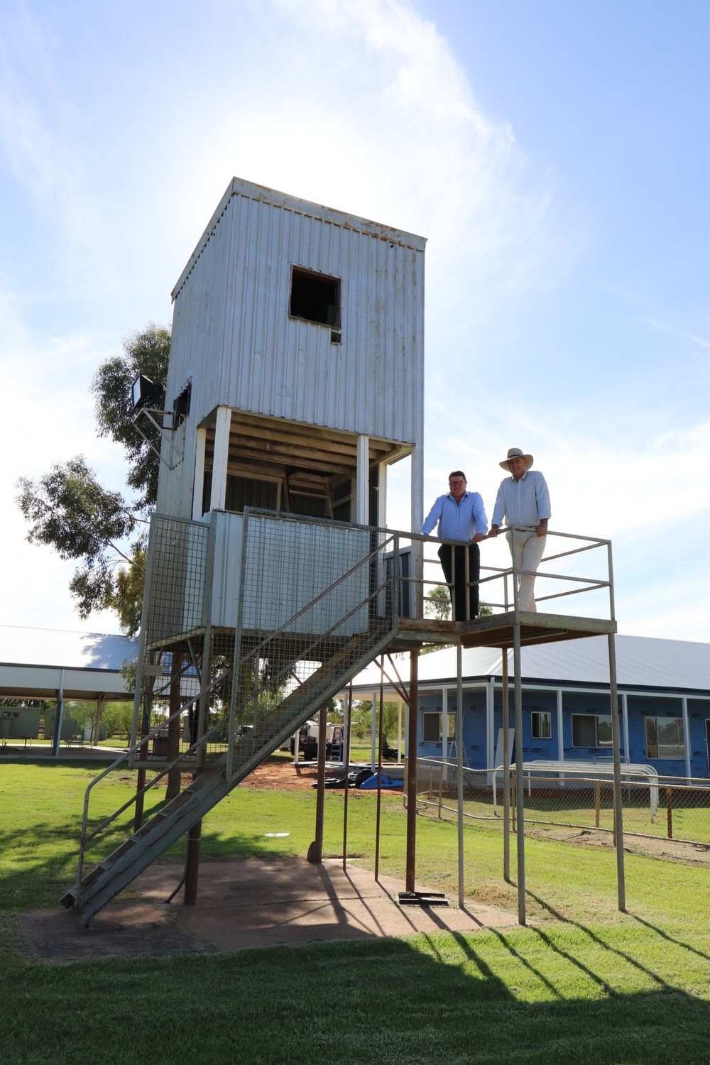Bourke Mayor Lachlan Ford and Jamie Chaffey on the current callers box at the Renshaw Sporting Complex