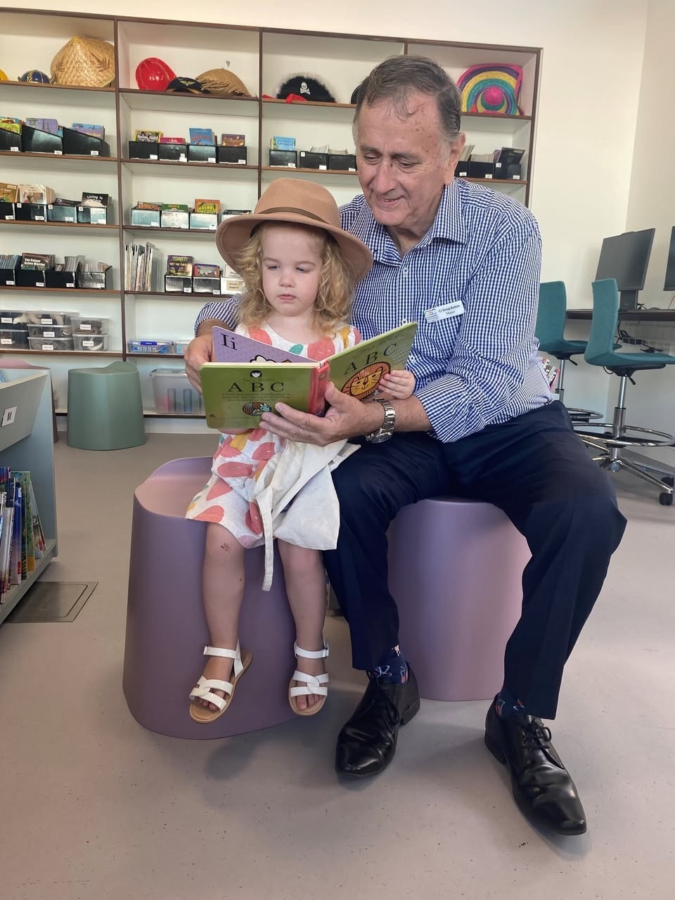 Gilgandra Mayor Doug Batten helps a young girl with her ABCs in the new library hub. Photo: Gilgandra Shire.