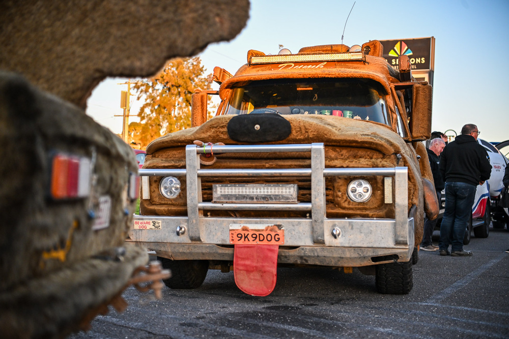 Most cars are coated in bright paint but the dog team, consisting of a dog, pup, mutt, and dog catcher, stands out by covering the vehicle in fur.Â