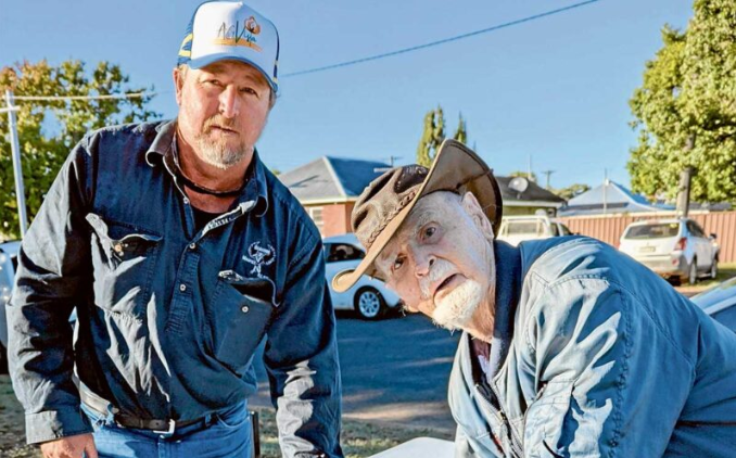 Adrian Worrell with fellow resident Garnett Martin signing a petition in May 2025 seeking a replacement police officer in Baradine. [IMAGE: Liz Cutts]