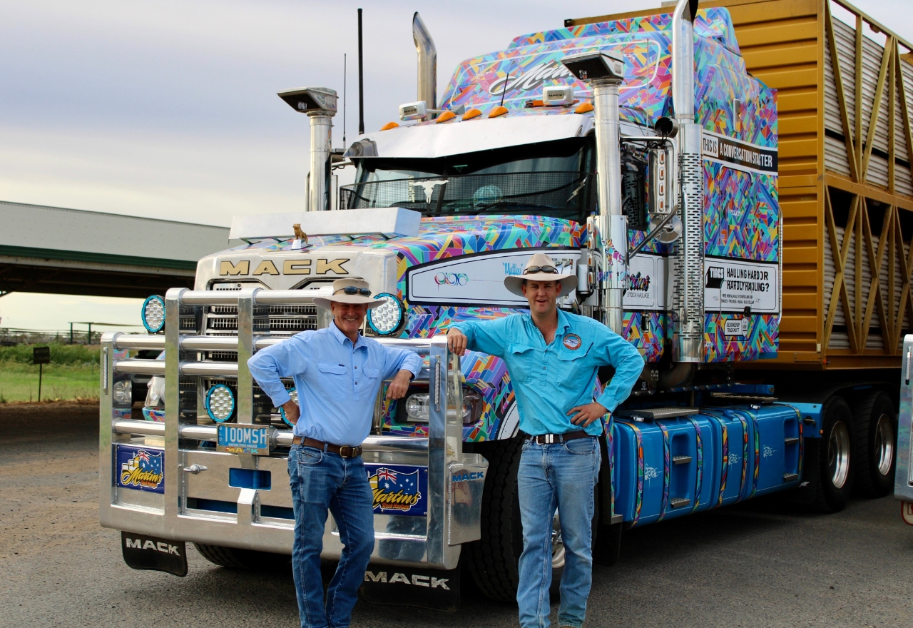 Coonamble Feedlot owners David and Angus Chadwick. The trucks also made a stop there on their way back to Queensland. IMAGE: supplied]