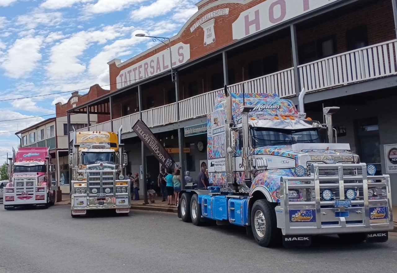 Road trains parked in the main street for Baradine's Men's Mental Health Day. [IMAGE: Evelyn Hampton]Baradine was buzzing on Saturday 21 February when three specially painted trucks visited town to support Beyond Blue and spark conversation about depression.