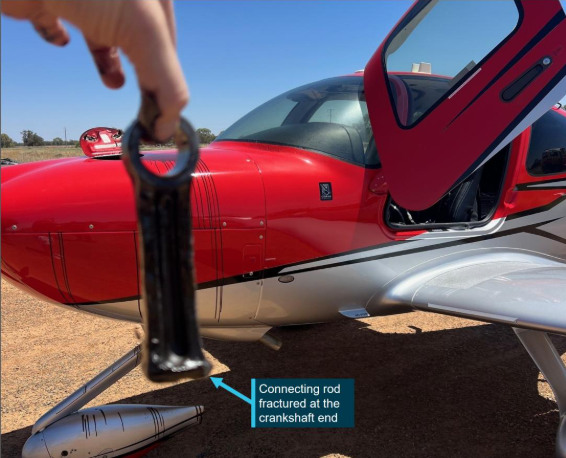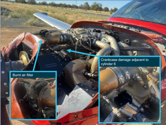 A connecting rod had separated from the crankshaft and the air filter was visibly damaged by fire.