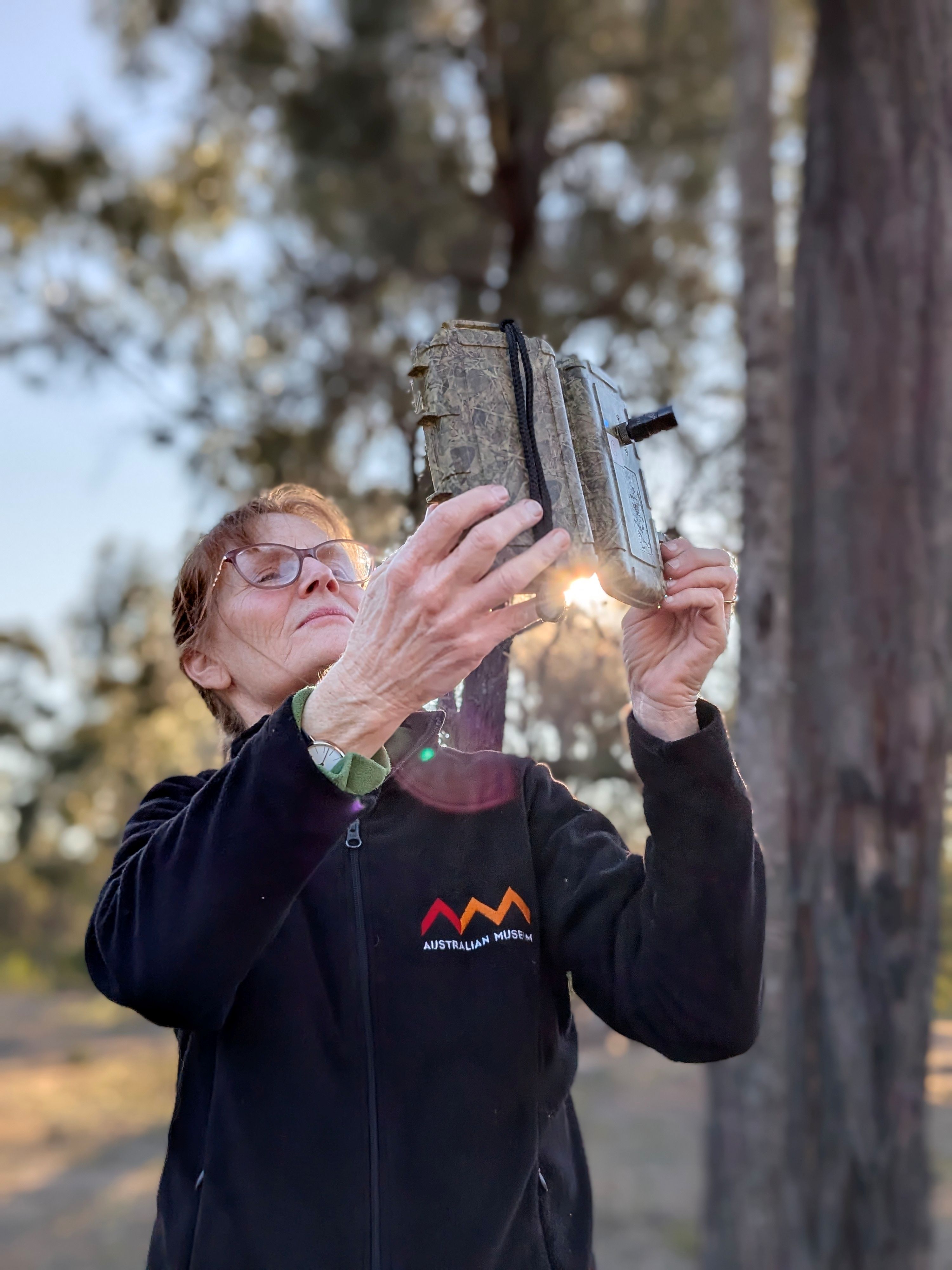 Bush Blitz member, Sandy Ingleby with a bat acoustic trap recently used to collect specimens and data in the Pilliga. (Image: Brian Lessard)