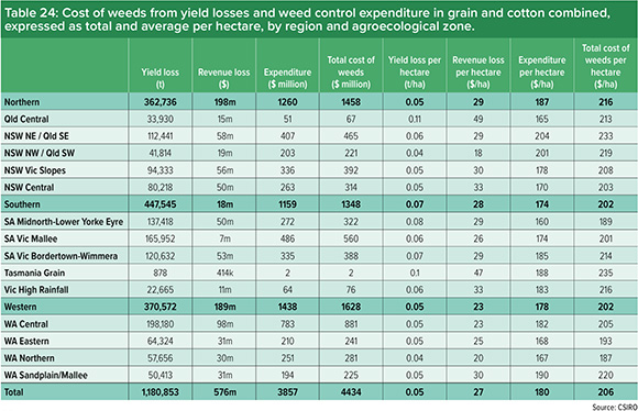 Cost of weeds from yield losses and weed control expenditure in grain and cotton combined, expressed as a total and average per hectare, by region and agroecological zone. Source: CSIRO