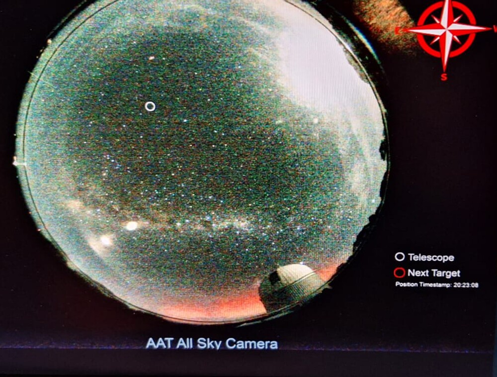 Image of the aurora taken by the Siding Spring Observatory all-sky camera showing as a red glow in the south. [IMAGE: SSO]