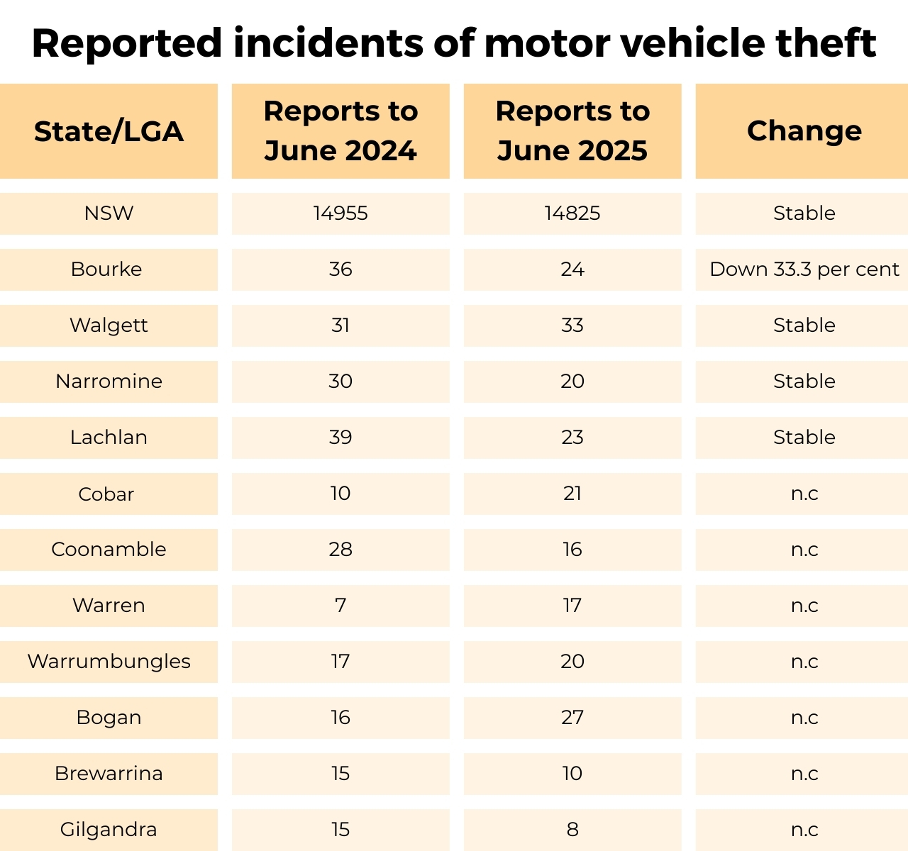 Bourke, Coonamble and Narromine saw drops of more than 50 per cent for reported offences including vehicle theft, malicious property damage and break and enter.