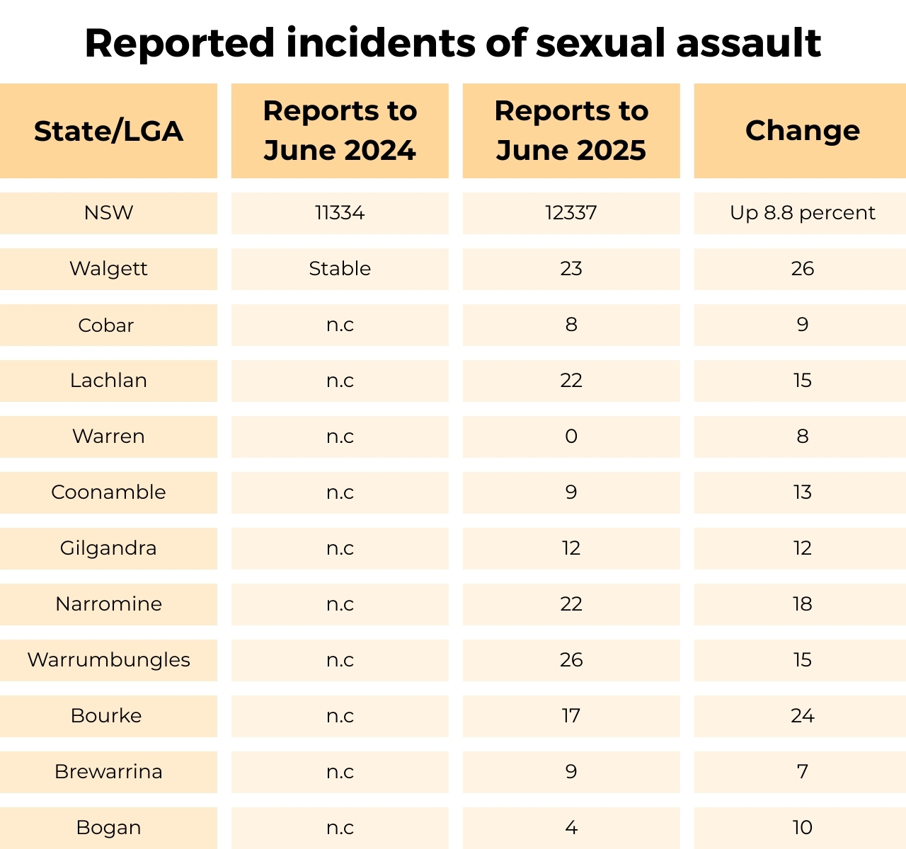 While NSW recorded a 8.8 per cent jump in sexual assault reports up to June 2025, almost no Western Plains shire saw a notable increase.