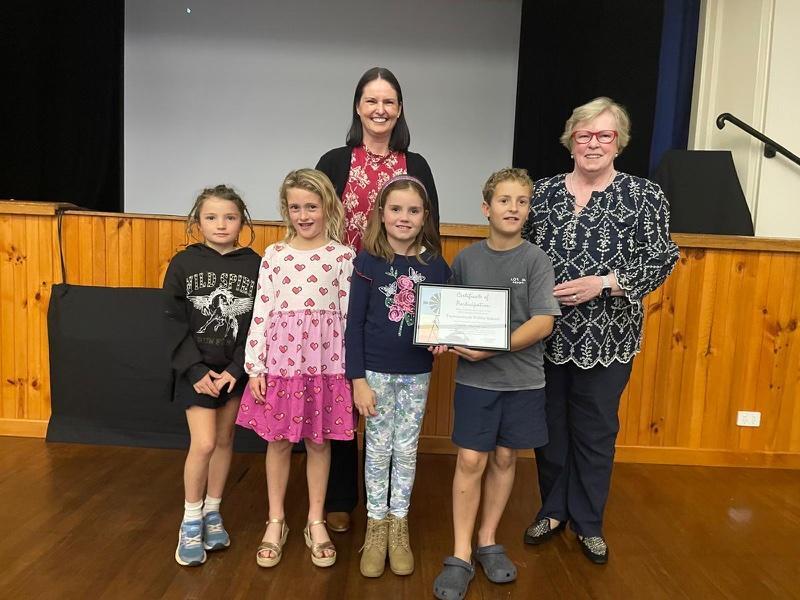 Children from Tooraweenah Public School receive certificates by Festival Director Sue Armstrong (right) and Tooraweenah principal Karen Smith. IMAGE SUPPLIED.