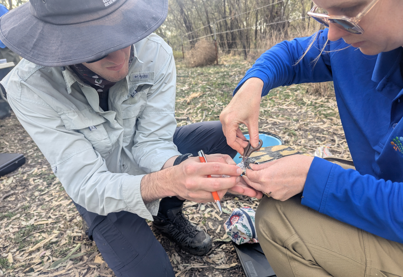 In October the pair partnered up with Commonwealth Environmental Water Holder (CEWH) researchers to collect data and implement tracking devices on the reptiles.