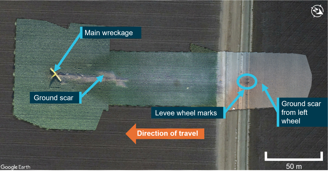 The descent led the aircraft’s left main wheel to touch down near the edge of the field, with the aircraft travelling for a further 27 m before both landing gear wheels struck an irrigation levee that ran perpendicular to the end of the field.