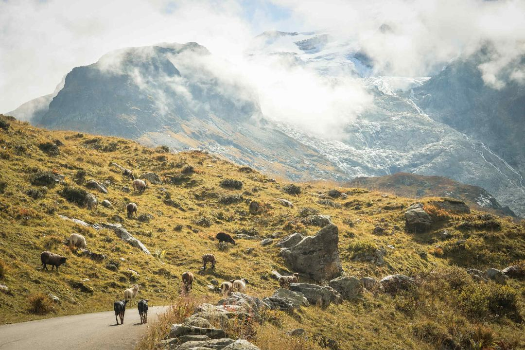 "Since the alpine season was just ending, we were able to help gather a few sheep at the Susten Pass, who were peacefully enjoying their alpine summer by the beautiful and mystical Steingletschersee.