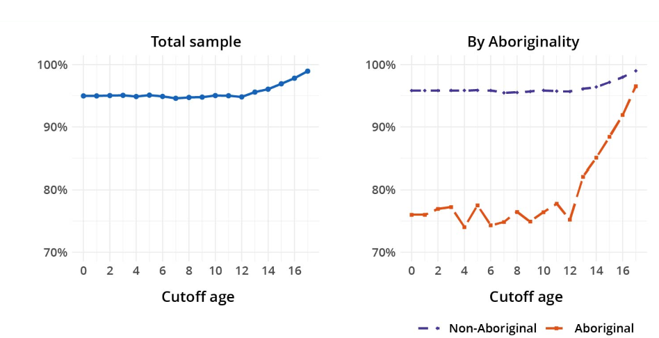 Accuracy of prediction models for first criminal justice contact before age 18 by age cutoff, showing the proportion of correct predictions for the total sample, Aboriginal children, and non-Aboriginal children